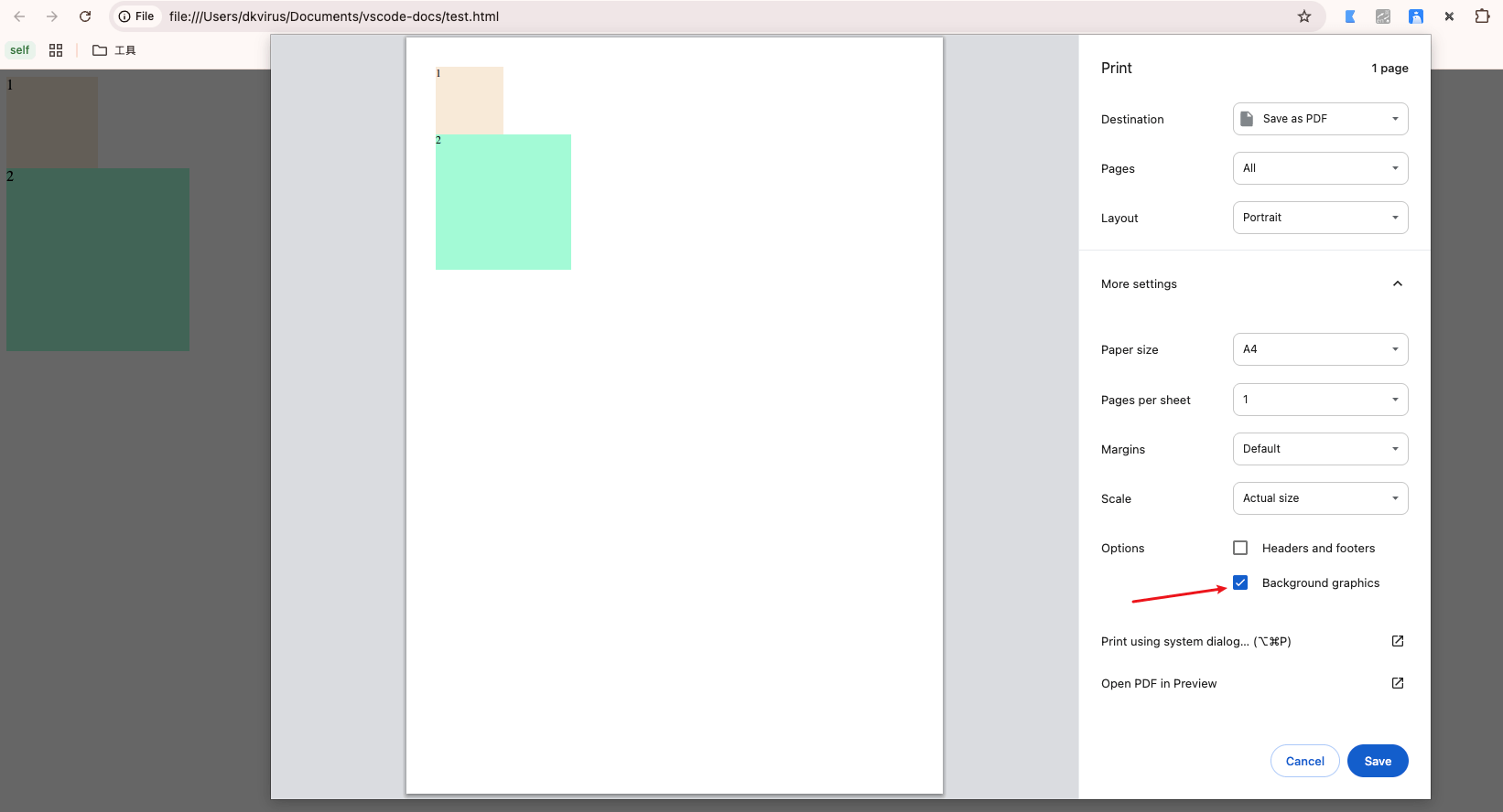 注意: 打印预览没有显示背景颜色,原因是浏览器默认隐藏了打印的背景颜色,在 More settings 中勾选 Background graphics 就可以看到背景颜色了(见下图红色箭头)。