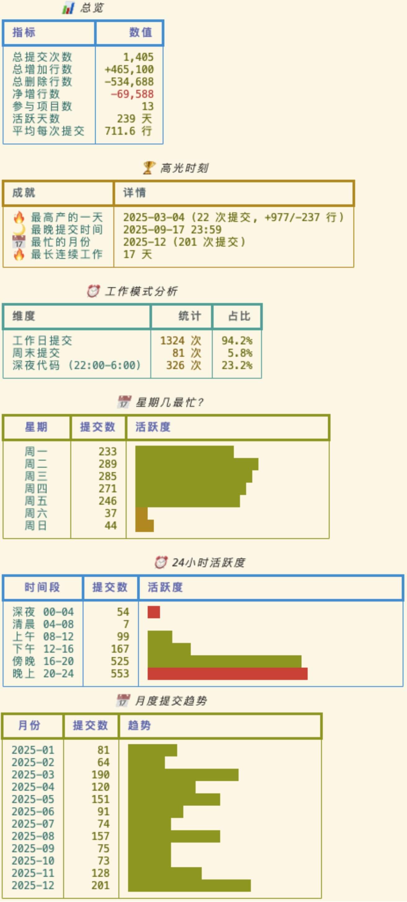 - 2025年新增了46.5w行代码,删除了53.4w行代码,看着是负贡献,其实是维护的好几个项目都非常的陈旧,这一年在不断地写组件,做优化,减小代码复杂度;