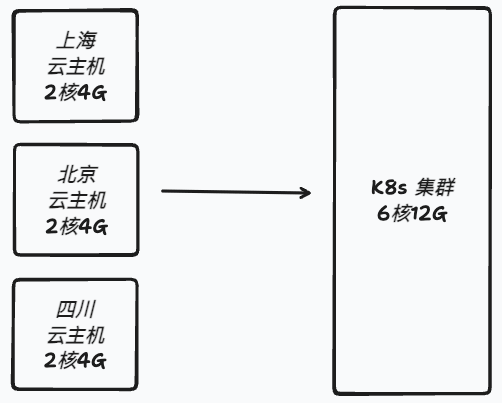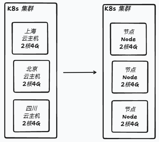 比如有三台云主机,每台配置是2核4G,通过安装和配置可以将三台云主机变成一个 K8s 集群,对集群使用者来说好像是拥有了一台机器,这台机器的配置是6核12G。(每台云主机有自己的系统进程,实际使用内存肯定是比12G小的)