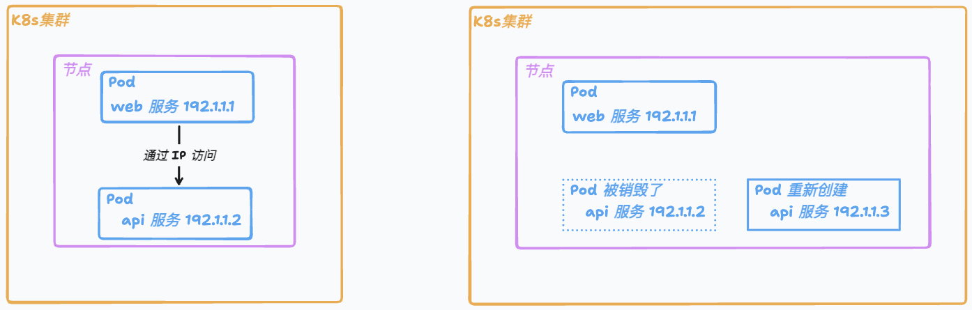 然而,Pod 是动态且短暂的。它们可能因为多种原因被销毁并重新创建,例如节点故障、应用扩缩容(上面介绍的副本集数量变化),容器实际使用的资源(如内存)超过其定义的限制(limits)。每次Pod被重新创建后,K8s 会为其分配一个新的 IP 地址。如果客户端(如 web Pod)依赖固定的 Pod IP 地址进行通信,那么后端 Pod 的 IP 变化将导致服务中断。