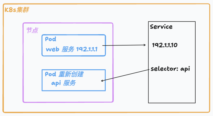 Service 在集群内有固定的 IP 地址(ClusterIP)。客户端(如 web Pod)只需访问该地址,Service 通过标签选择器(selector)与一组功能相同的 Pod (如 api Pod)动态关联。
