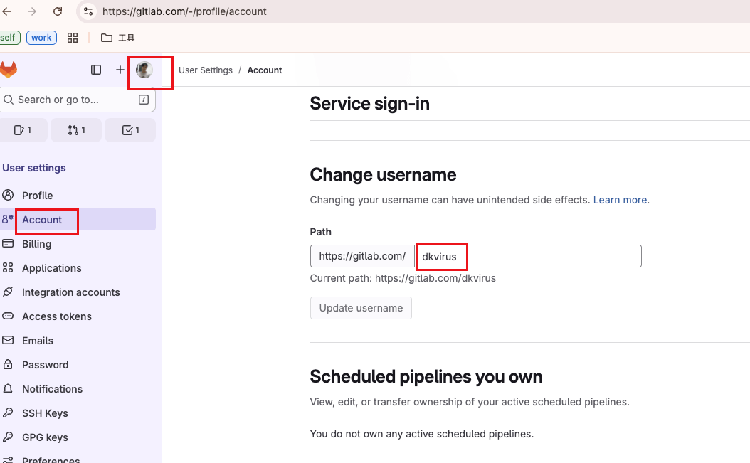 GitLab 用户名;前往 gitlab 网页 -> 点击头像 -> 点击 Edit Profile -> 点击左边的 Account -> 往下拉找到 Change username 可以看到用户名;