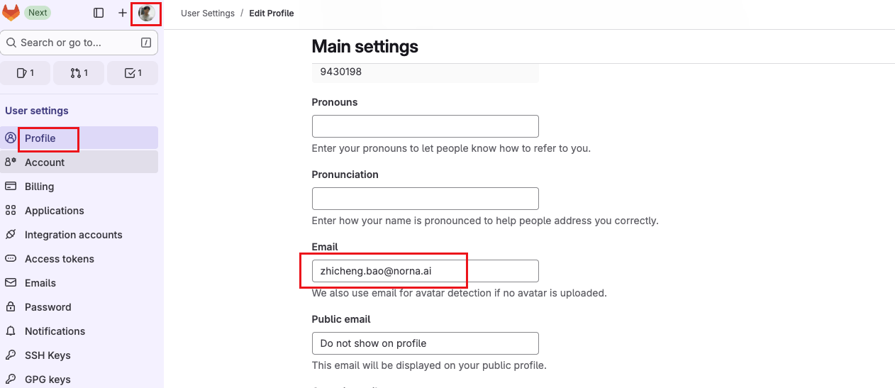 GitLab 邮箱;前往 gitlab 网页 -> 点击头像 -> 点击 Edit Profile -> 点击左边的 Profile -> 往下拉找到 Email;