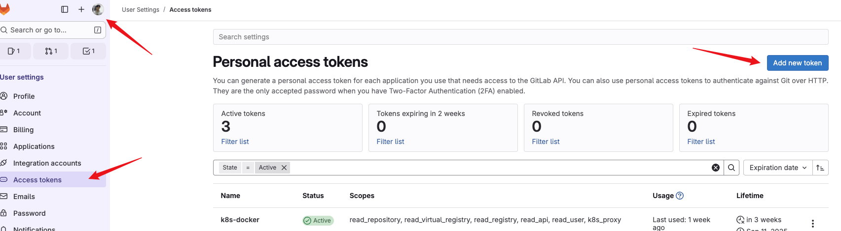 前往 gitlab 网页 -> 点击头像 -> 点击 Settings -> 点击左边的 Access Tokens -> 点击右上角 Add new token -> 填写 token 名称 + 设置过期时间 + 勾选 read 权限 -> 保存 -> 在页面上方会有 token 文本,是以 glpat-xxxx 开头的字符串,保存到本地,刷新页面后就看不到这个 token 了;