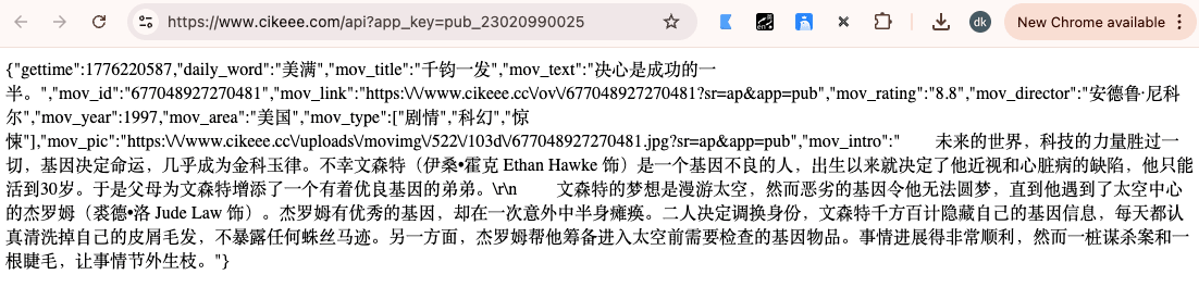 点击上图中红框内的文字,浏览器会在新标签页为你展示今日的电影信息——这个页面网址,就是API接口。