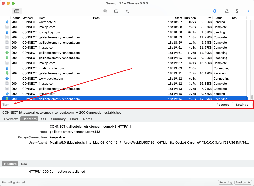 当你启动 Charles,你会发现这个列表会不停地刷新 HTTPS 请求。
