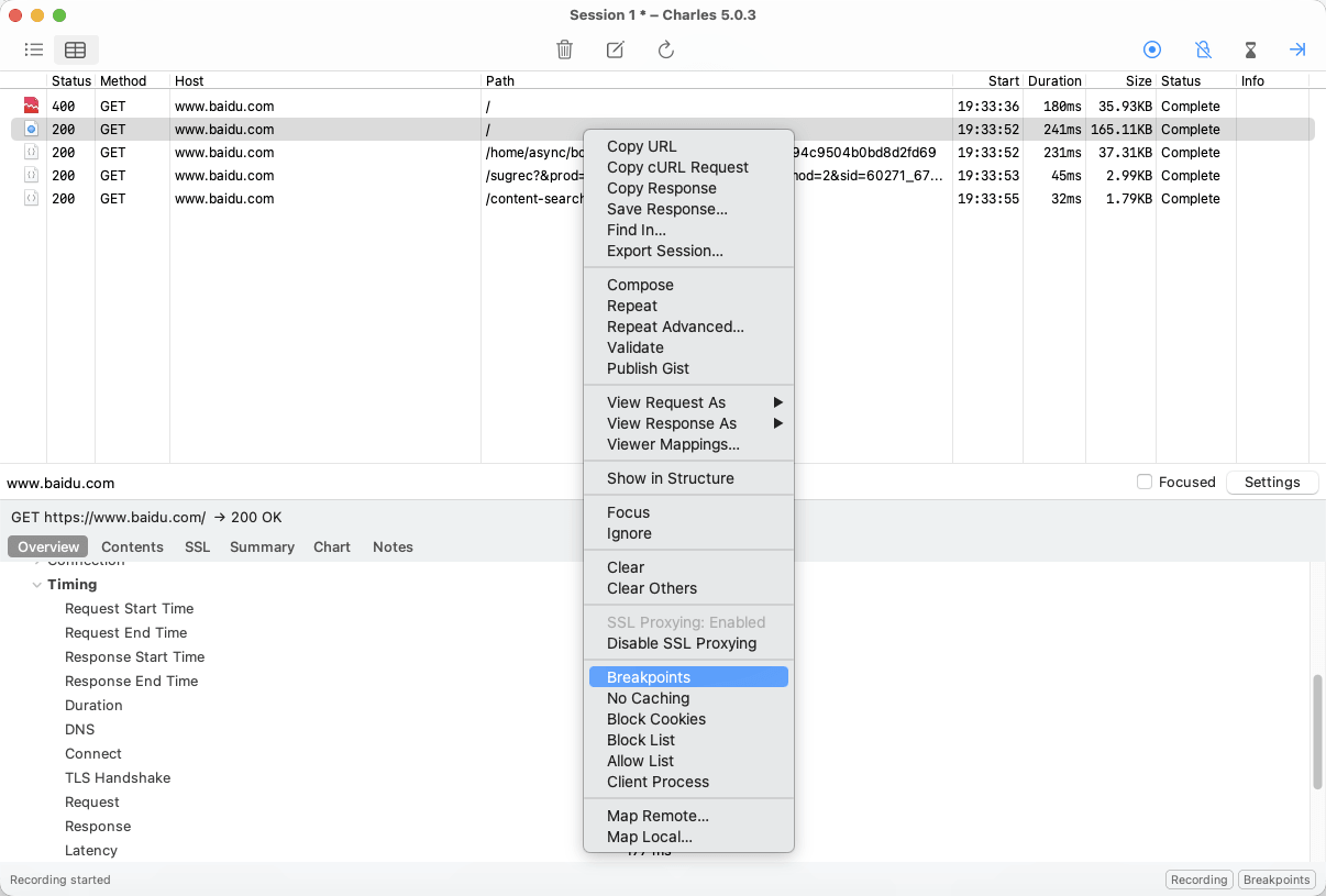 在 Charles 里面找到这个请求,鼠标右键点击,选择 Breakpoints,相当于打了个断点,之后所有 https://www.baidu.com 请求都会进入该断点: