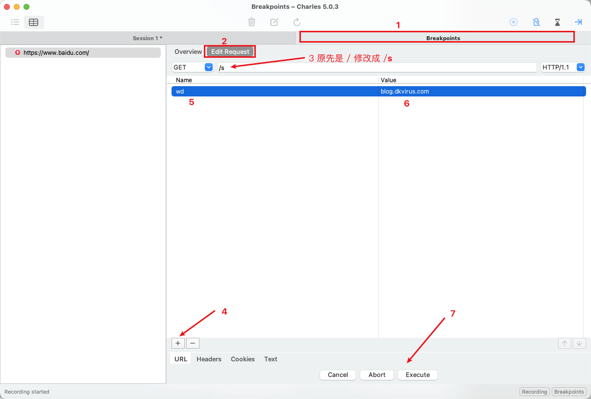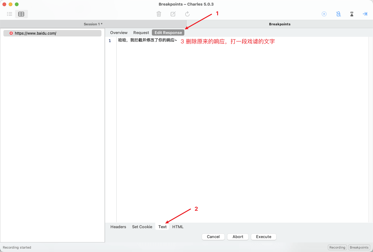 回到浏览器再次请求 https://www.baidu.com,会自动跳到 Charles 断点处,如下图,按照数字顺序依次操作。(这里为什么这么改,下一步介绍)