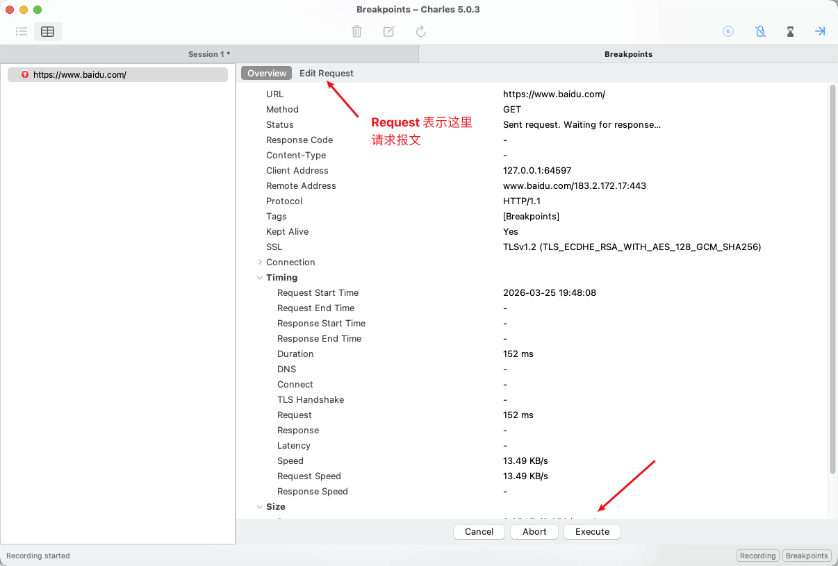 回到浏览器,请求 https://www.baidu.com,这一次在 Charles 断点里,我们不修改请求报文,直接点击 Execute 放行请求。