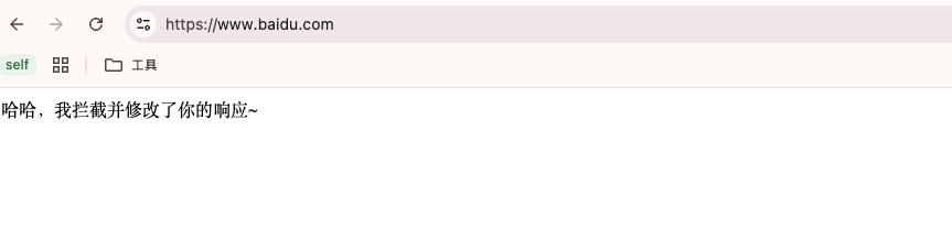 回到浏览器,看到浏览器地址栏是 https://www.baidu.com,但网页内容不是百度首页,变成了我们自己修改的响应内容。