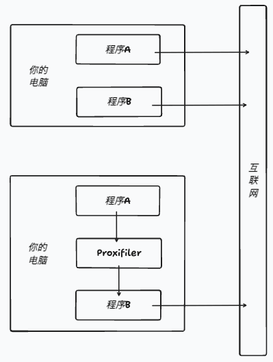Proxifier 自己不是代理,下图中的程序 B 才是代理。