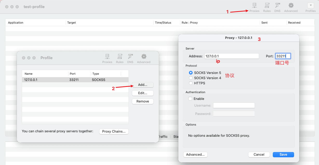 - 在右边弹窗中,填写代理 的 ip、端口和协议,让 Proxifier 能找到代理。