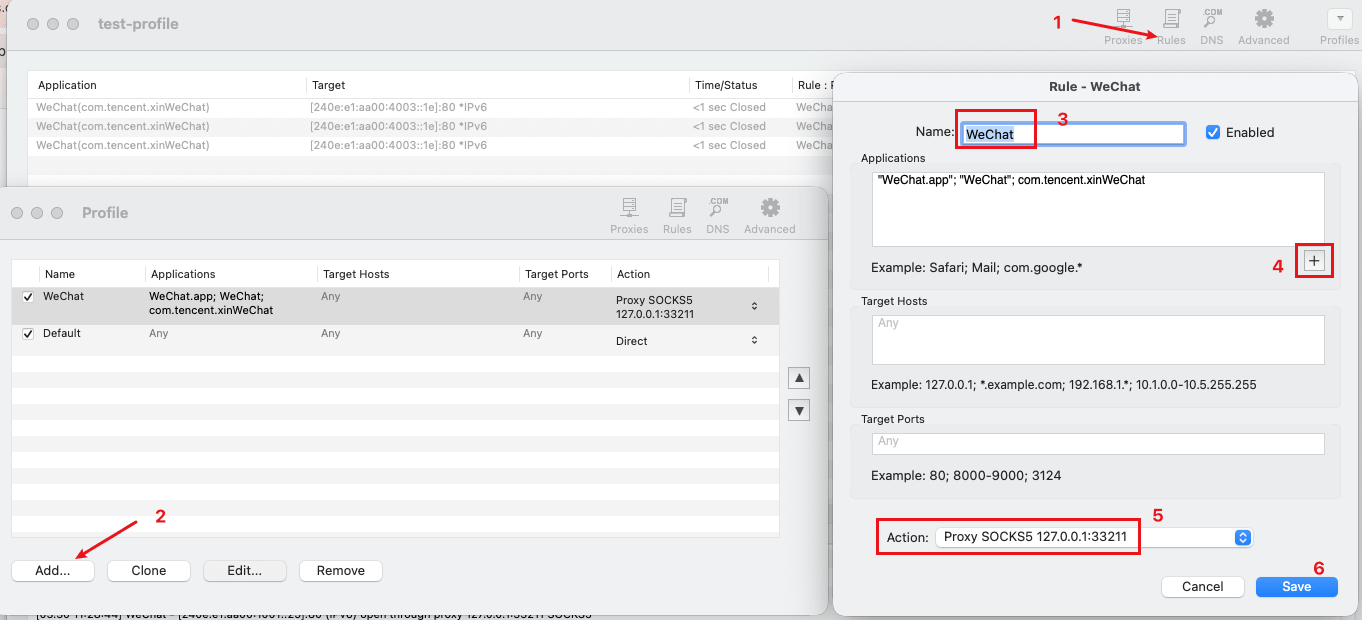 - 红字5选择上一步添加的代理,含义是让微信这个程序的流量都走这个代理。